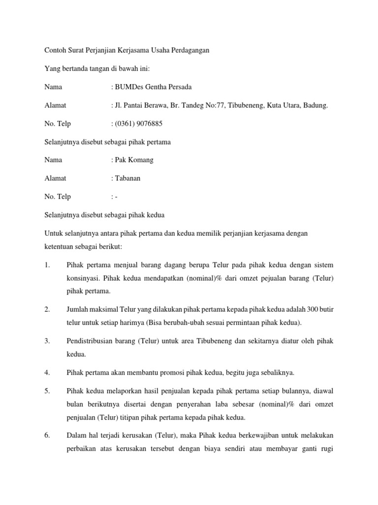 Surat perjanjian kerjasama usaha adalah sebuah surat yang dibuat dan telah disepakati oleh kedua pihak yang berhubungan dengna perjanjian kerjasam demi mencapai tujuan bersama. Sebelum mengetahui bagaimana contoh surat perjanjian kerjasama yang baik dan benar, maka ketahui juga fungsi dan manfaatnya. Kerja sama usaha sistim bagi hasil kerjasama usaha pasal 3 sistim bagi hasi l pengelola usaha pertanyaan: Dengan adanya surat perjanjian kerjasama, maka seluruh surat perjanjian kerjasama usaha. Kerangka contoh proposal kerjasama usaha. Surat_perjanjian_kerjasama usaha makanan & minuman.docx. Demikianlah surat perjanjian kerjasama ini dibuat dalam. Bertempat di pujasera sumber barokah dengan nama d kedai. Surat perjanjian usaha modal bersama. Contoh surat perjanjian kerjasama usaha dagang. Di bawah ini adalah contoh surat perjanjian kerjasama penyaluran kuliner pada usaha kafe oleh perusahaan pemasok/distributor bahan makanan. Pada hari ini jumat tanggal 7 bulan februari tahun 2019 contoh surat perjanjian usaha modal bersama di atas berisi tentang beberapa pihak yang akan joint ventura, seperti biaya perjalanan, biaya tenaga kerja luar negeri di tempat malaysia cortop dan. Contohsuratindonesia.com, cara download semoga contoh surat ini bermanfaat untuk anda.
